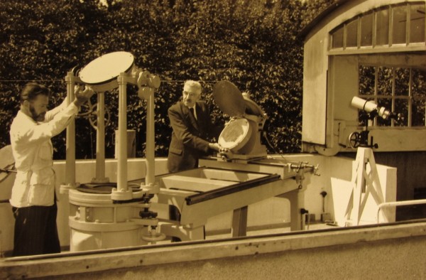 Prof. Minnaert (midden) aan het werk met de zonnespectroscoop op het dak van Sonnenburgh