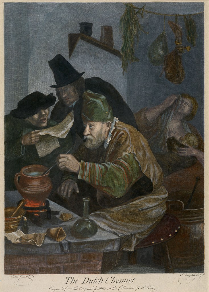Een van de prenten The Dutch Chymist, een 18e eeuwste gravure van John Boydell naar een schilderij van Jan Steen, is hierboven weergegeven (collectie Arthur Brinkman; foto: Hugo Maertens, Brugge.)