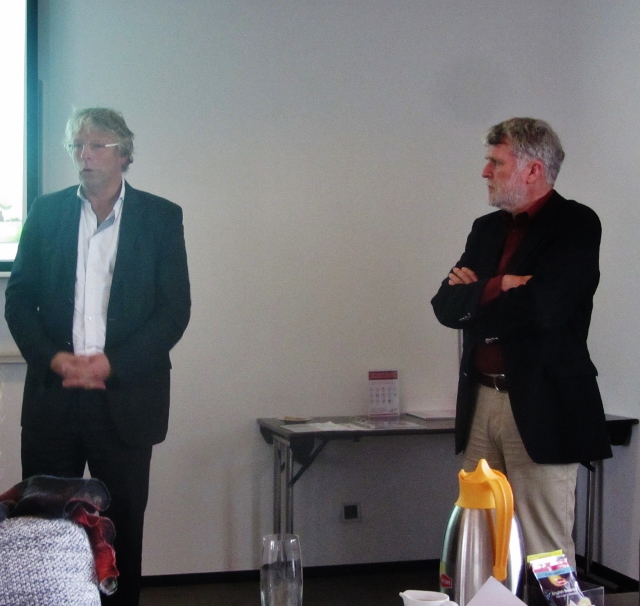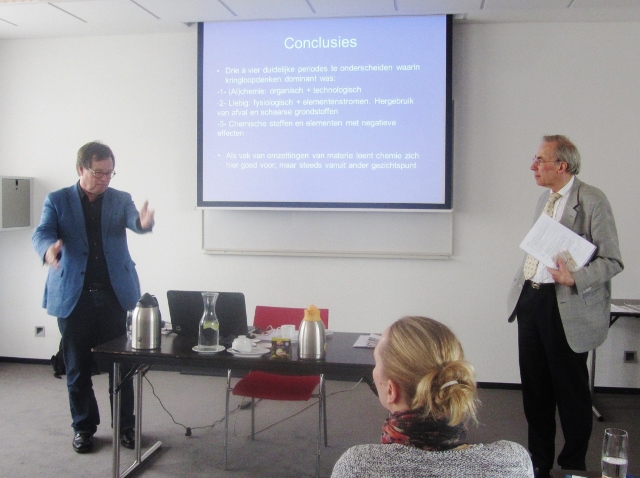 Het was aan Ernst Homburg, hoogleraar voor de geschiedenis van wetenschap en technologie aan de Universiteit Maastricht, om als eerste spreker het begrip kringloop te belichten (op de foto links met voorzitter Rob van Veen). Zoals de titel van zijn voordracht 'Kringloopdenken in chemie en economie: een eeuwenoud verhaal' al doet vermoeden, is het begrip kringloop bepaald geen thema van de laatste jaren. Het is verankerd in de chemie, maar het kringloopdenken verloopt cyclisch vanaf de beginjaren van de (al)chemie tot de dag van vandaag. De achtergrond van de kringloopgedachte verschilt wel in de loop der eeuwen. Gewezen werd op de lopende wisseltentoonstelling in Museum Boerhaave 'Rijk aan Rotzooi' over het hergebruik zo'n 200 jaar geleden van industriële en agrarische afvalstoffen onder meer voor mest. Maar economische redenen van hergebruik van materialen kunnen samen gaan met een natuurfilosofische beschouwing dat het leven een grote kringloop is. Aan het einde van de twintigste eeuw was de zorg voor het milieu naast schaarste een stuwende kracht om afvalstromen te bewerken en stoffen te herwinnen. De laatste conclusie vat de lezing kort en bondig samen: 'Als vak van omzettingen van materie leent chemie zich goed voor het kringloopdenken maar steeds vanuit ander gezichtspunt'.