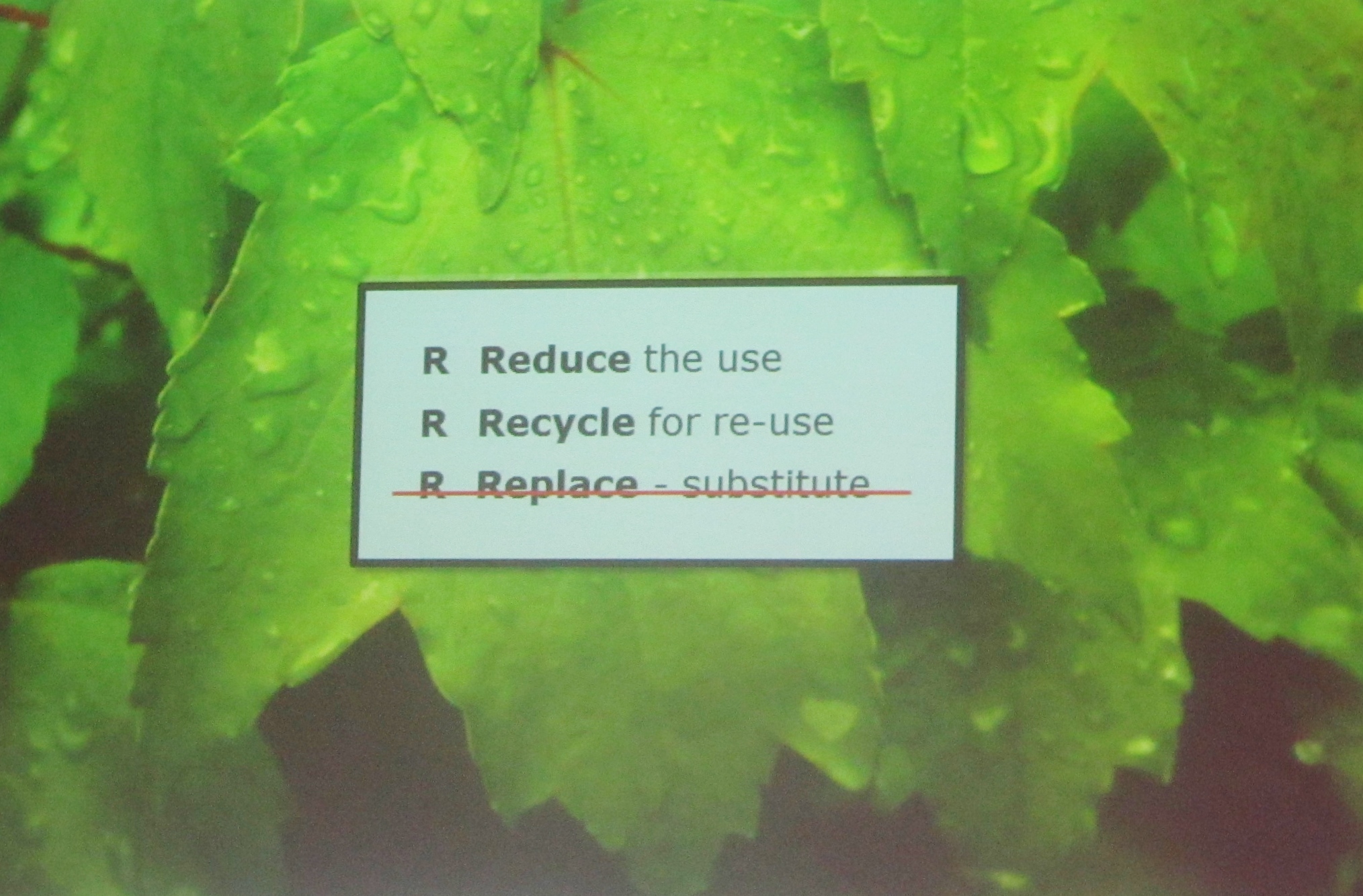 Na de koffiepauze kwam de toekomstige fosforproblematiek aan bod. Koop Lammertsma, hoogleraar organische en organometaal chemie aan de Vrije Universiteit Amsterdam, plaatste nog een vraagteken achter de titel van zijn voordracht "Peak phosphorus" - Een element in gevaar? De elementen stikstof en fosfor zijn beide bepalend voor het leven op aarde. Stikstof in de buitenlucht kan via het Haber-Bosch proces worden omgezet in ammoniak en in kunstmest worden verwerkt, maar fosfor voor de productie van kunstmest is nog grotendeels afkomstig uit de fosfaatmijnen. Ongeveer 75% van de wereldvoorraad aan fosfaaterts komt uit Marokko en de hoeveelheid is eindig. Er zijn verschillende voorspellingen gedaan over de voorraden. Dana Cordell van de University of Technology, Sydney plaatst de "Peak phosphorus" al rond het jaar 2030. Het element fosfor kan niet verloren gaan, maar wordt enorm verspreid en verdund in allerlei afvalstromen. Hoog tijd om die te gaan benutten en een aantal voorbeelden werd gegeven in de presentatie. De terugwinning van fosfor uit urine middels kristallisatie tot struviet [MgNH4PO4.6H2O] klinkt aardig maar het zout lost slecht op. Er is dus nog heel veel te doen voor de chemici. En welk proces er ook wordt ontwikkeld, de kringloop zal nooit volledig zijn. In mei 2014 trad Lammertsma ook op voor de CHG in een symposium over zeldzame aarden. Hij eindigde toen zijn betoog met de drie R's: 'Reduce the use, Recylce for re-use, Replace -substitute'. In het geval van fosfor eindigde hij nu met de laatste R doorgestreept. Fosfor is voor het leven op aarde nu eenmaal niet te vervangen door een ander element.