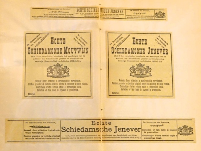 De branders in de jeneverstad Schiedam waken sinds het begin van de twintigste eeuw over de kwaliteit van hun moutwijn en jenever. In 1902 werd na twee jaar discussie door de Schiedamse gemeenteraad een echtheidszegel ingevoerd. Het langwerpige zegel bestaat nog steeds en wordt over de dop van een fles geplakt. Daarmee garandeert de gemeente de echtheid. Veertig jaar na de invoering schreef distillateur C. Dirkzwager een boekje over dit echtheidszegel. Het Nationaal Jenevermuseum wijdde er een kleine tentoonstelling aan.