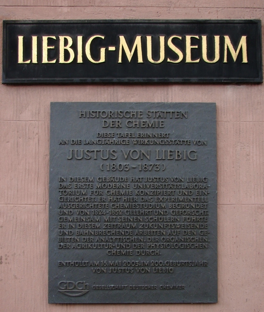 Plaquette aan het Liebig Museum in Giessen, aangemerkt als een Historische Stätte der Chemie in 2003 (Foto Eric Wils, klik op de foto van een vergroting).