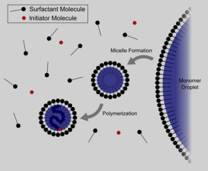 Zijn onderzoekbelangstelling richtte zich verder op emulsiepolymerisatie, microstructuur van copolymeren en polymere katalyse. Emulsiepolymerisatie is een complex proces met een heterogeen reactiesysteem bestaande uit drie verschillende fasen: de waterige fase, een colloïdale dispersie van polymeerdeeltjes en een monomeeremulsie (illustratie uit de Engelstalige Wikipedia). De producten vinden onder meer toepassing in verf en coatings.