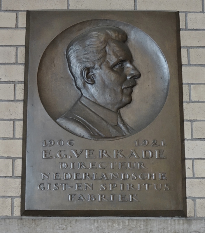 Ericus Gerhardus Verkade, jr. (1868-1927), directeur van Verkade’s Fabrieken te Zaandam en directeur van de Nederlandsche Gist- & Spiritusfabriek NV te Delft van 1906-1921, zie Biografisch Woordenboek van Nederland, www.historici.nl.- In het Grote Kantoor van de voormalige Gist- & Spiritusfabriek aan de Wateringseweg hangt een plaquette voor hem (foto Eric Wils).