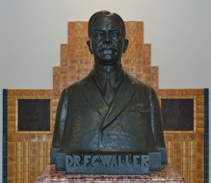 - In 1912 werd Waller sr. tot erelid van de KNCV benoemd. In het Grote Kantoor van de voormalige Gist- & Spiritusfabriek aan de Wateringseweg staat zijn borstbeeld ter gelegenheid van zijn 40-jarig directeurschap (foto Eric Wils).