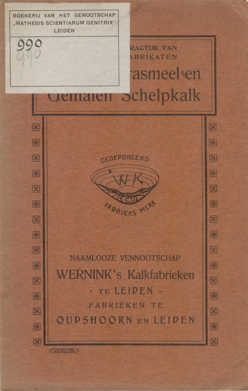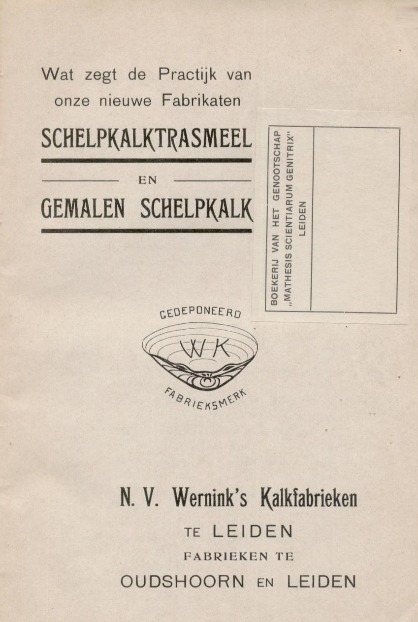 Wernink’s Kalkfabrieken uit Leiden begon in 1814 met de productie van schelpkalk. Honderd jaar later verscheen de brochure: ‘Schelpkalktrasmeel en gemalen Schelpkalk / Wat zegt de Practijk van onze nieuwe Fabrikaten (Leiden / 1914)’ (zie illustraties hiernaast). De brochure kreeg een plaats in de Boekerij van het Genootschap Mathesis Scientiarum Genitrix te Leiden. De firma Wernink Beton verhuisde in 2010 uit Leiden naar Vlaardingen. De Stichting Industrieel Erfgoed Leiden (STIEL) wijdde in maart 2011 een artikel aan de geschiedenis van de fabriek. Klik hier voor de verwijzing.